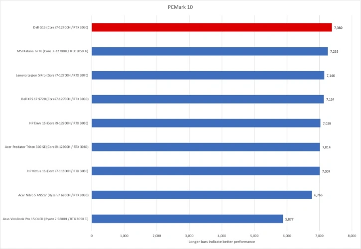 首先是PCMark 10,它衡量日常计算工作的性能,包括办公室工作效率任务、网页浏览和视频聊天。戴尔G16排在第一位,击败了配备相同酷睿i7-12700H CPU的其他系统以及配备酷睿i9-12900H芯片的两款系统。