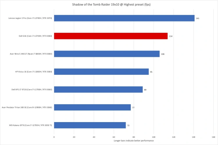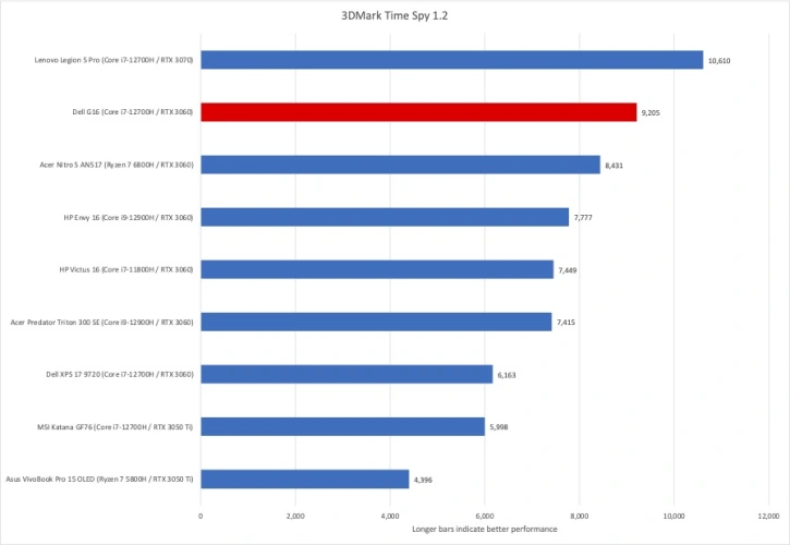 正如您很快就会看到的,Dell G16是一款出色的中端机型,在我们的应用程序和多媒体测试以及显卡和游戏测试中都取得了出色的成绩。我们比较了它的性能与其他基于RTX 3060的游戏笔记本电脑,以及配备RTX 3070显卡的联想军团5 Pro和一对配备RTX 3050钛显卡的笔记本电脑。