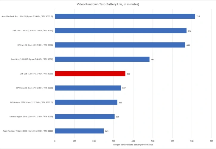 为了测试笔记本电脑的电池续航时间,我们使用Windows 11的电影和电视应用程序播放了一段4K视频,将笔记本电脑设置为飞行模式,并插入耳塞。我们将屏幕亮度设置为相对明亮的250尼特到260尼特,这对于在办公室里开着灯看电影来说是一个很好的亮度。戴尔G16的84瓦时电池在我们的电池耗尽测试中持续了6个小时,略低于平均水平。有了Dell G16,您将无法远离墙上插座。