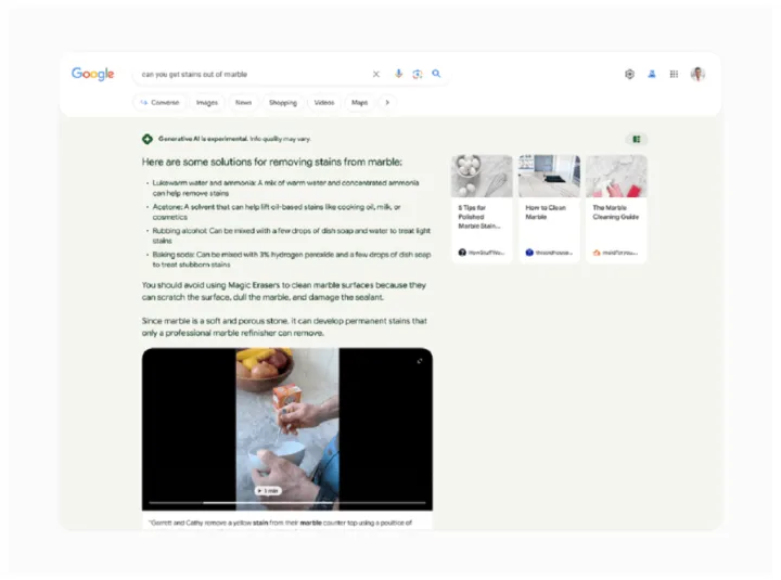 现在,谷歌表示,正在将整合的视频和图像添加到其合成答案中。值得称道的是,这些视频似乎直接归属于视频的正下方,所以至少你会看到是谁创造了这些内容。