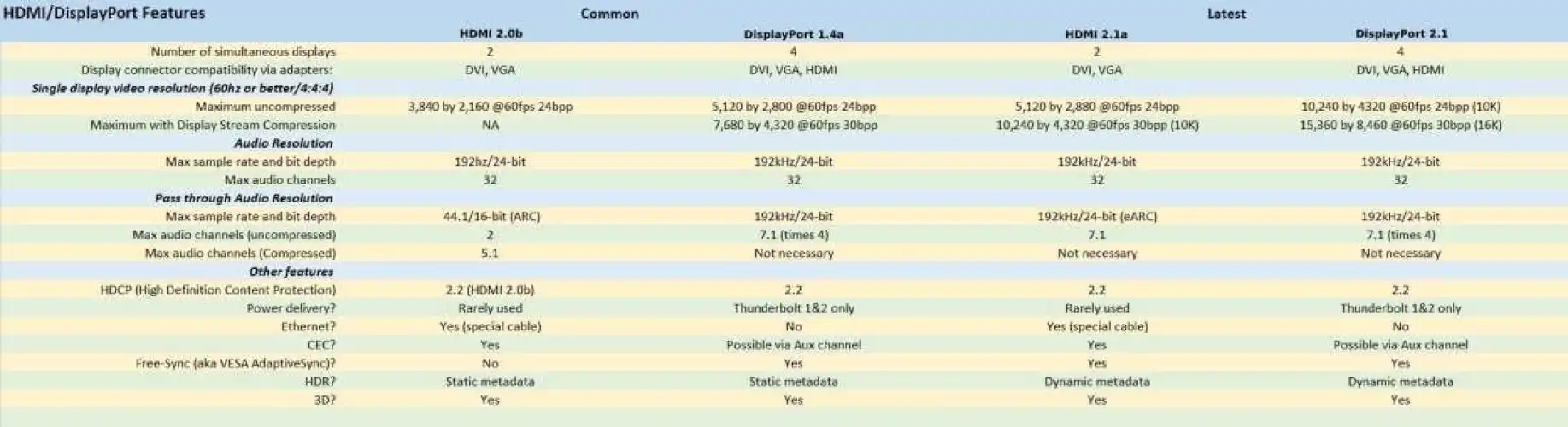 请注意,上述每秒48Gbps和80Gbps分别是原始HDMI 2.1a和DisplayPort传输速度。DisplayPort 2.1有四个通道,可传输约77.37Gbps(每通道19.34Gbps)的实际数据,而DisplayPort 1.4a可传输32.4Gbps(每通道6.48Gbps)。HDMI 2.0提供14.4Gbps,而较旧的HDMI 2.1提供42.6Gbps。