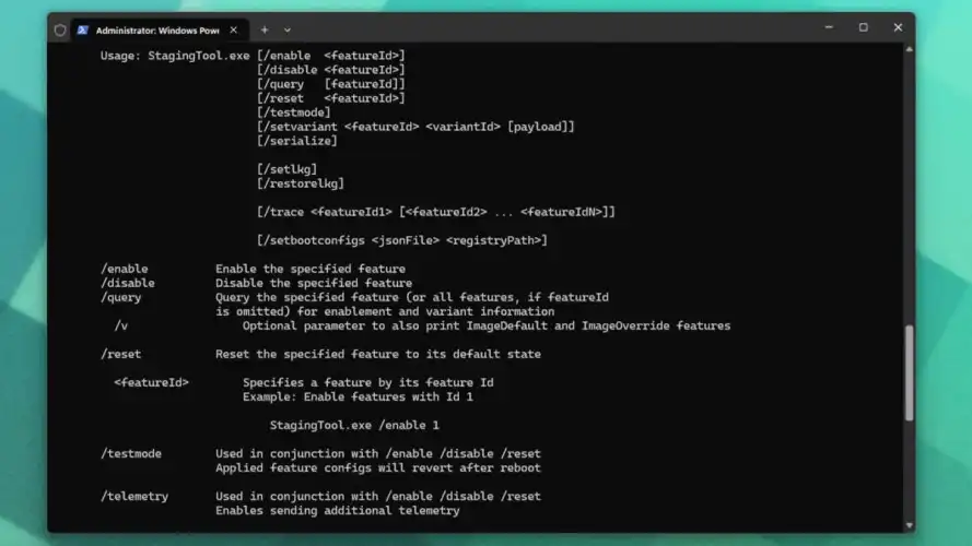 一旦您获得了StagingTool.exe文件,您将需要展示您的老式命令行技能。使用管理员权限打开命令提示符或Windows终端实例。导航到存放可执行文件的文件夹,然后键入“StagingTool.exe/?”以查看命令列表。