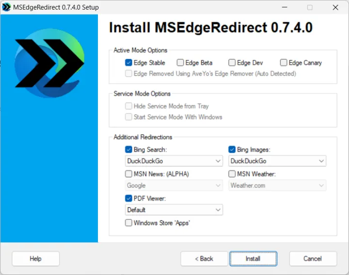 在安装过程中,请确保选择“活动模式”,这将提高应用程序的性能。在下一个屏幕上,使用“其他重定向”设置来选择用于网络搜索的搜索引擎。