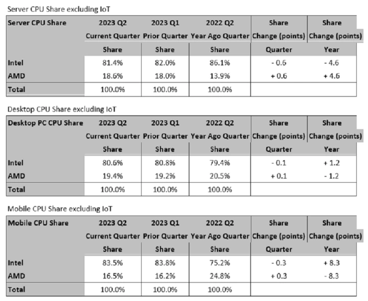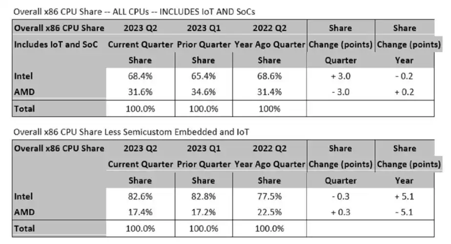 在AMD和英特尔之间正在进行的赛马中,英特尔赢了:如果把物联网和嵌入式SOC(AMD出售给游戏机)考虑在内,英特尔在本季度的市场份额增加了5.1个百分点。在台式机CPU方面,英特尔增长了1.2个百分点;在移动领域,英特尔的份额飙升了8.1个百分点。