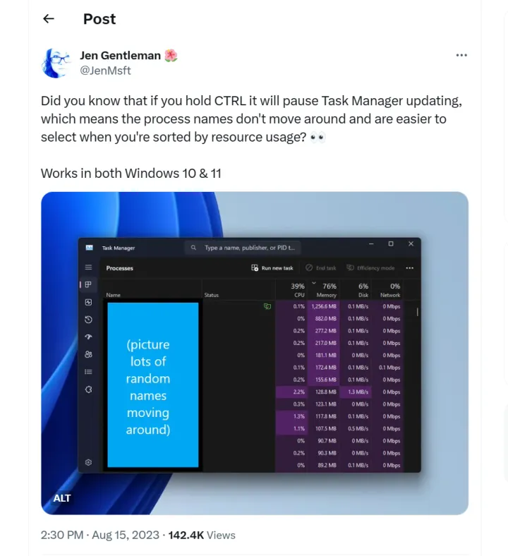 本文出自Jen Gentleman之手,他是一名Windows工程团队成员,经常在推特上谈论这类小技巧。被The Verge发现,这个键盘快捷键在Windows 10和Windows 11中都可以使用,当你试图点击任务管理器进程时,它会跳到列表中的不同位置(或者暂时消失),这一点很方便。按住Ctrl可停止窗口的持续刷新。你仍然可以通过其他方式与这些应用程序互动,比如选择它们或点击下拉箭头以获取更多详细信息。
