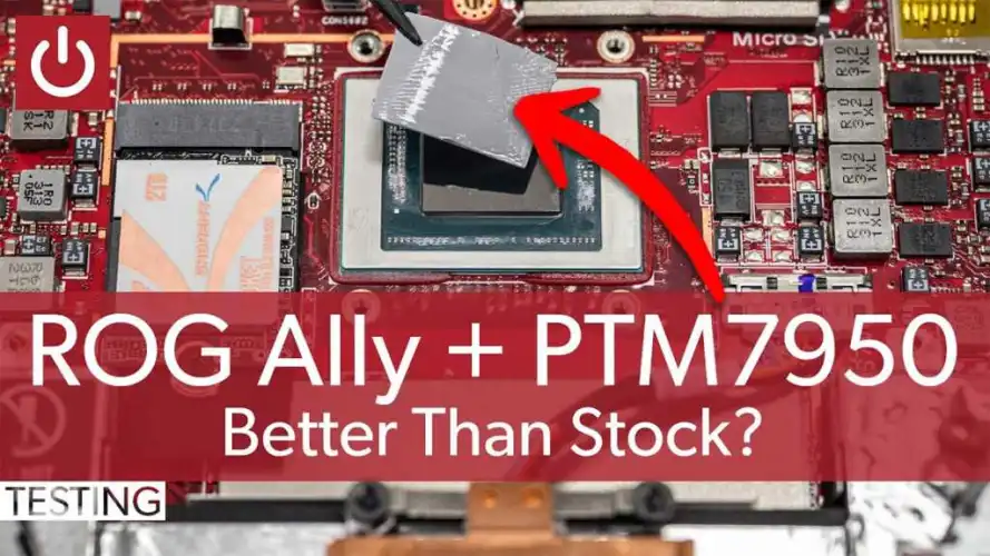 在运行基准基准并打开零售ROG Ally单元后,Adam断开了电源,将库存的双风扇冷却器从主印刷电路板上取下,并清除了原始的热糊。然后,他使用了KryAert热灰熊,这是一种很受欢迎的台式游戏PC售后贴剂。然后,他重新组装了Ally,进行了更多的基准测试,并重新进行了整个过程,去掉了KryAert浆糊,并应用了定制的热垫PTM7950。它是一种界面材料,完好无损,适合简单的OEM式应用。