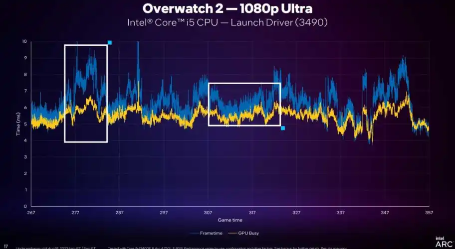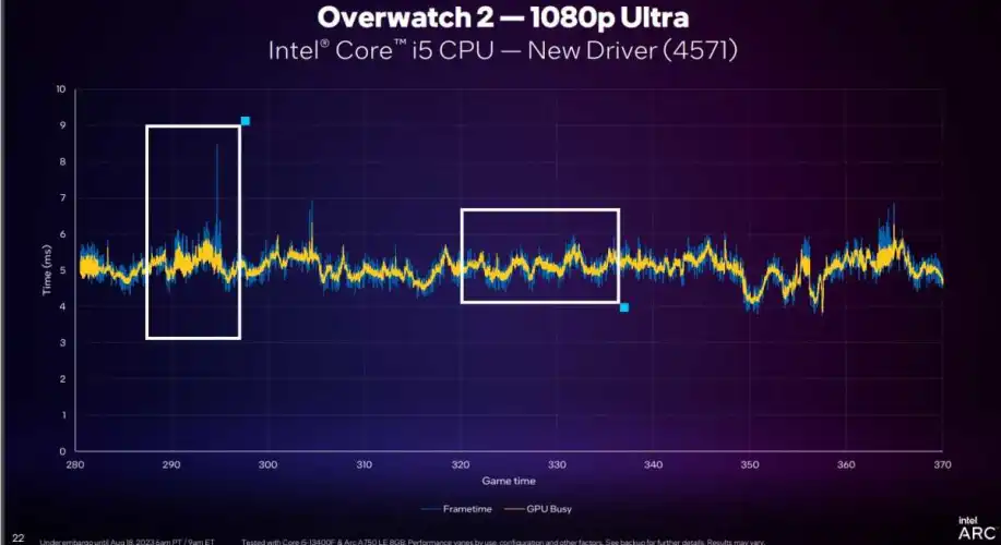 正如你所看到的,当使用Arc A750的S启动驱动程序时,OW2并非如此;蓝色线条到处反弹,提供不一致的体验。现在,使用最新的英特尔驱动程序和重新设计的DX11代码,游戏运行起来更加流畅–即使两个驱动程序的黄色“GPU忙”线保持在大约5到6毫秒。英特尔成功地对其驱动程序进行了微调,以减少系统其他方面导致的疯狂帧时间峰值。