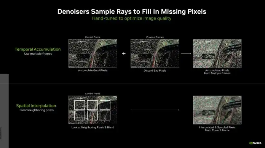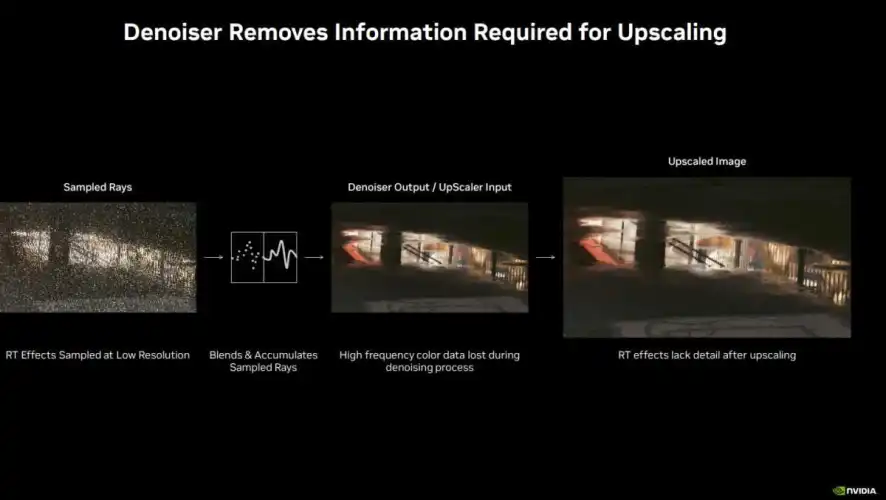 这一切都很好,很好,而且是必要的,但它会变得有点复杂,特别是当涉及到DLSS时。DLSS以比您的显示器更低的分辨率运行,然后使用AI Smarts将图像升级到您的原始分辨率。传统的手工调整消噪器对光线跟踪场景的片段进行采样-无论是在时间上、在多个帧上,还是基于相邻像素的空间模型-并使用这些信息来填充光线无法通过的缺失像素。