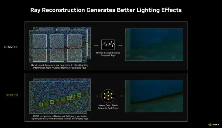 输入DLSS 3.5。NVIDIA的新光线重建技术用人工智能支持的消噪器取代了手动调整的消噪器,该消噪器经过训练,可以识别时间和空间去噪的好像素和坏像素,具体识别光线跟踪效果,并结合其他游戏信息-如运动矢量和表面颜色-在光线跟踪游戏中获得更准确的最终图像,如下图所示。