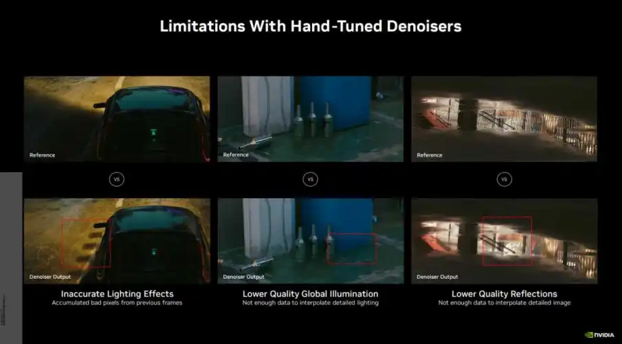 任何玩过光线追踪游戏的人都知道,最终的结果是非常好的。但NVIDIA表示,传统的去噪器有时会产生略差的输出,导致在特别详细的场景中出现较低质量的反射和全局照明,有时还会产生不准确的照明效果。你有没有玩过这样的游戏,你的车的灯似乎是从你的车底发出的,而不是从车头灯发出的,或者看到它的侧视镜在你的车旁边跑来跑去?去噪和DLSS相互作用的方式就是原因所在。