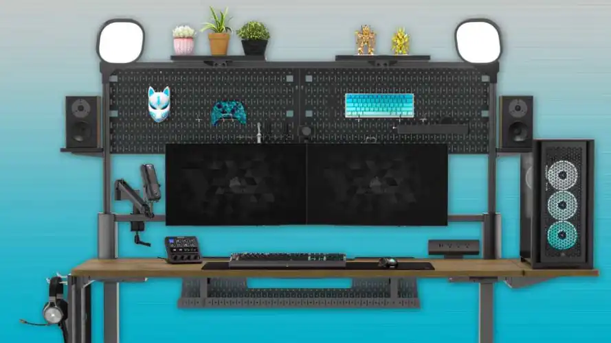 在默认状态下,Platform:6(由The Verge发现)是一张六英尺宽的黑色叠层办公桌,有钢架,没有发动机–这是非常基本的东西。首批可用的升级产品是立式马达,配有常见的LCD控制器,外加“核桃色橡胶木”,以获得更优雅的表面。真正有趣的东西来自于附加组件。Corsair说,这张桌子的特点是有一个可扩展的轨道系统,可以增加后面的货架,一个用于直接安装显示器和麦克风支架的横杆,高架扬声器平台,甚至还有车间式的挂板,用于悬挂设备或装饰品。