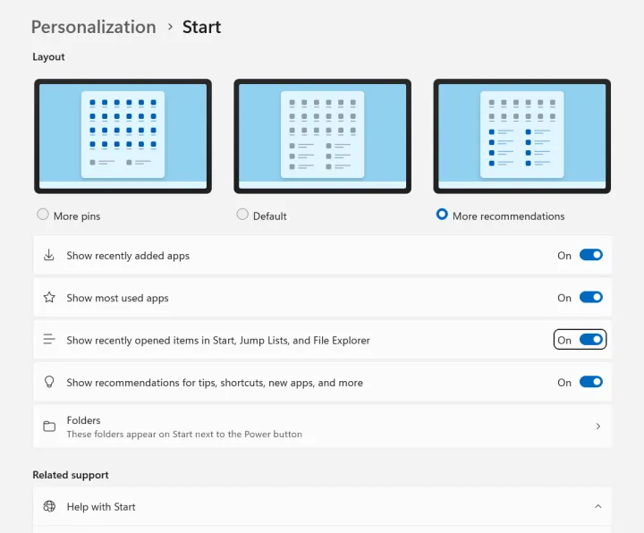 公平地说,微软强调这一新功能可以关闭,这是件好事。如果你还没有,花点时间仔细研究一下微软上面强调的开始个性化功能:在开始、跳转列表和文件资源管理器中显示最近打开的项目是关闭整个推荐部分的开关。