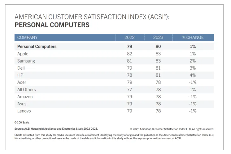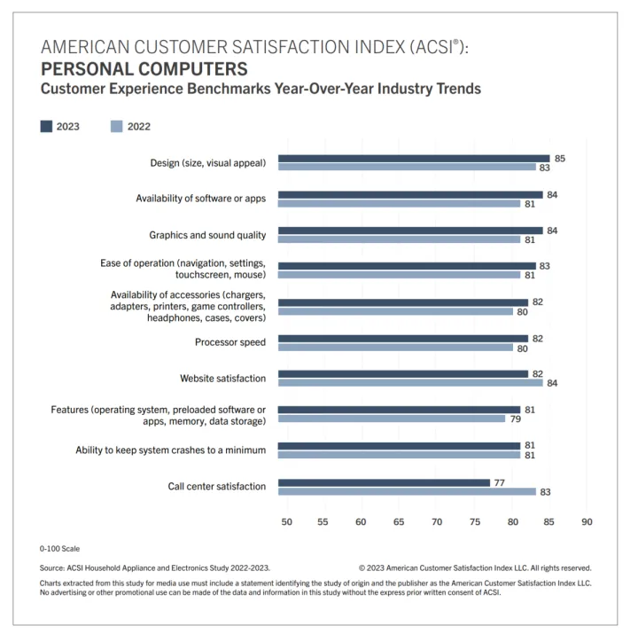 这并不是说大多数消费者批评他们的PC。虽然苹果和三星的得分最高,为83分,但得分最低的联想,在满分为1到100的情况下,满意度指数仍为78。