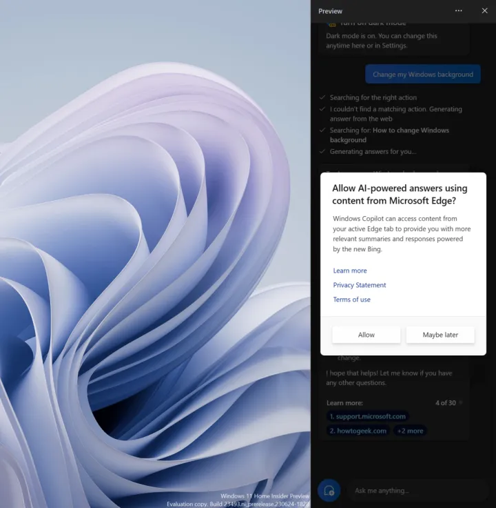 Windows Copilot(现在只是Copilot):微软基于人工智能的Bing Chat和Cortana的组合,与Edge中Copilot品牌的功能捆绑在一起。