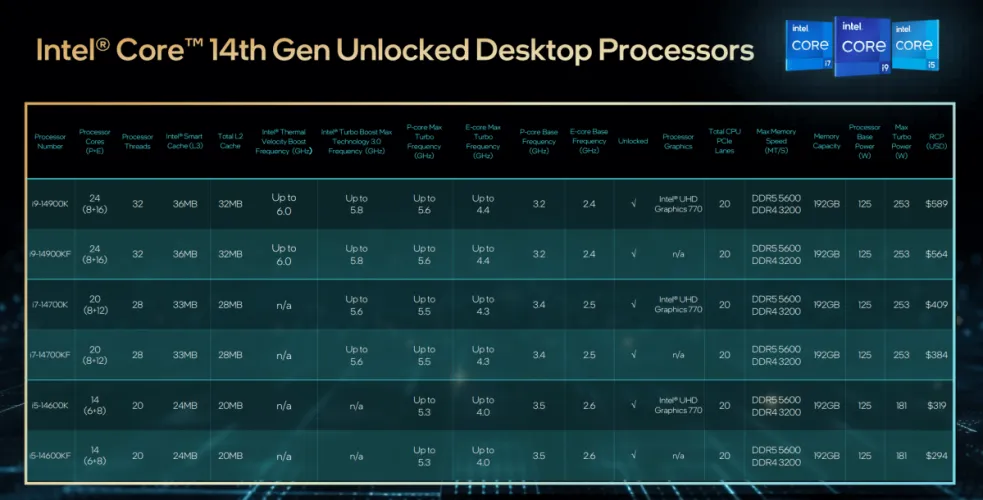 酷睿i5-14600K(6个P核,3.5 GHz/5.3 GHz;8个E核,2.6 GHz/4.0 GHz):319美元,F机型294美元