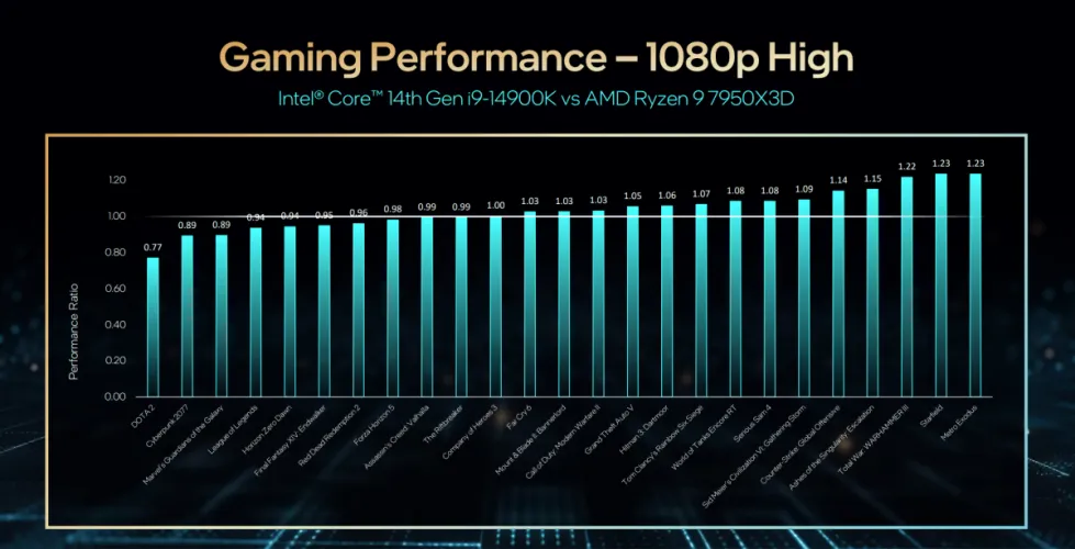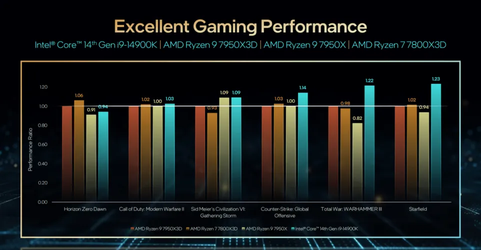 令人惊讶的是,英特尔没有公布在第14代酷睿上玩的任何游戏的代际比较。根据钱德勒的说法,如果不考虑APO的影响,改善幅度将在“中位数个位数,或许是上位数”范围内。相反,英特尔把重点放在了与竞争对手AMD的比较上,并试图展示其第12代和第14代处理器之间更明显的界限。