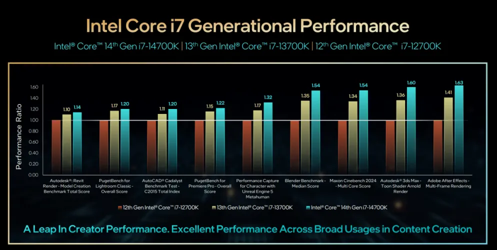 也许并不令人意外的是,英特尔没有提供与自己处理器的直接代际比较,尽管它选择了几个内容创作基准来突出其酷睿i7-14700K。其中,性能改进的范围从3%(Adobe Lightroom)到18%(Autodesk)。英特尔发烧友PC和工作站业务副总裁兼总经理罗杰·钱德勒表示,酷睿i7在酷睿i7上拥有有史以来最好的多线程性能。