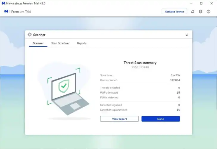 但Malware Bytes也有其不利之处。如果你在安装过程中不小心,它会自动在你的所有浏览器上安装自己的扩展,而免费版本经常会提醒你升级。此外,除非你禁用其实时保护功能(免费用户只有14天的试用期),否则它们将覆盖微软自己的病毒扫描程序。