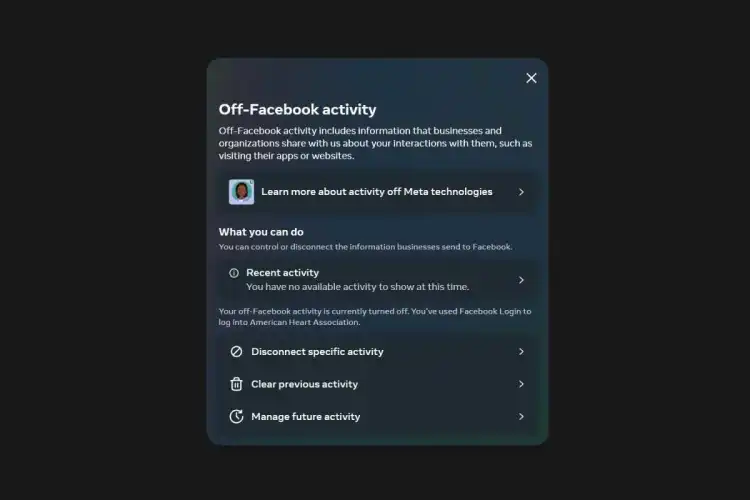 要阻止它,请转到“脸书外活动”页面(在移动应用程序中,你可以在Facebook设置>脸书外活动下找到这个页面),然后按照以下两个步骤操作: