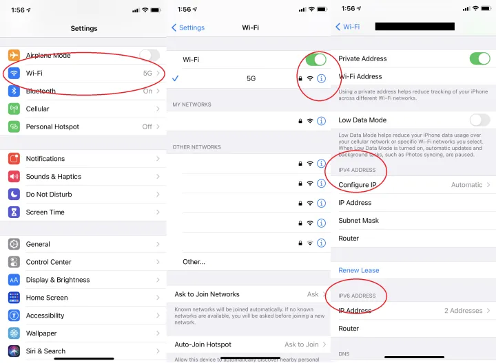 在iOS/iPadOS上,进入设置>Wi-Fi,然后点击你正在使用的网络旁边的圆圈里的“i”。IP地址、子网和路由器(网关)都将位于IPv4和IPv6部分下,如下所示。