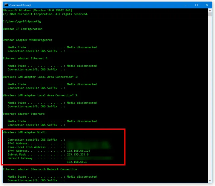 显示的不仅仅是IP地址:您将看到IPv4地址(如果支持,还会看到IPv6)、子网掩码以及默认网关(即您的路由器)。查看中间那行数据,它显示了连接类型:“无线局域网适配器Wi-Fi。”如果我使用的是有线连接,它会在“以太网卡”下面显示信息。