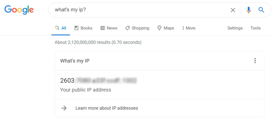检查您的路由器的公共IP地址的最简单方法是搜索“What is my IP?”在搜索引擎上。