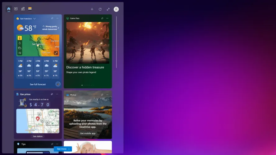 只需一次鼠标点击(或快速点击Win+W),Windows 11就可以提供丰富的信息。现在,你可以获得天气、股票价格、体育更新和娱乐新闻,这些卡片正在慢慢地加入新的功能,比如Xbox Game Pass。与完全改用浏览器并查看标签页相比,这是一种更容易保持最新状态的方法。如果我们幸运的话,Windows11预览版中的显卡–如Messenger、Phone Link和PC性能监控–将会全面发布。