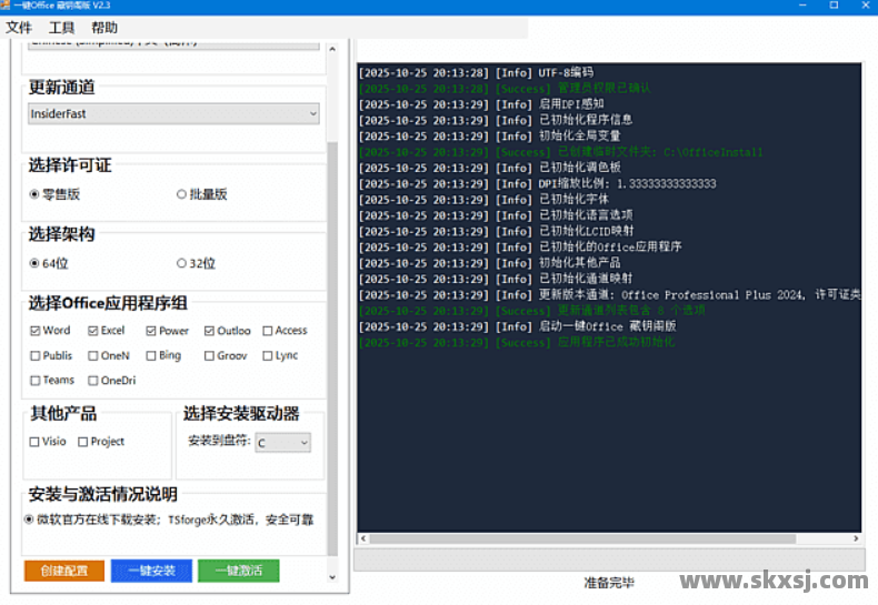 集成 “创建配置 – 一键安装 – 一键激活”全流程功能,从安装配置到激活操作,无需复杂手动步骤,小白用户也能轻松完成 Office 部署,大幅降低技术门槛。