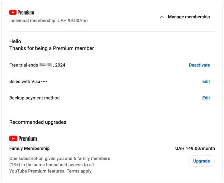 下一次尝试是在乌克兰,那里的情况更好。我从连接到乌克兰的一台VPN服务器开始。然后,我创建了一个新的谷歌账户,并将乌克兰设为我的国家。接下来,我去了Payments.google.com,首先添加了一个乌克兰地址(我采用了谷歌自己的地址),然后是我的普通支付卡。下一步是访问youtube.com/mium并购买这项服务。我从银行得到了关于授权在线购物的惯常问题,然后就完成了。