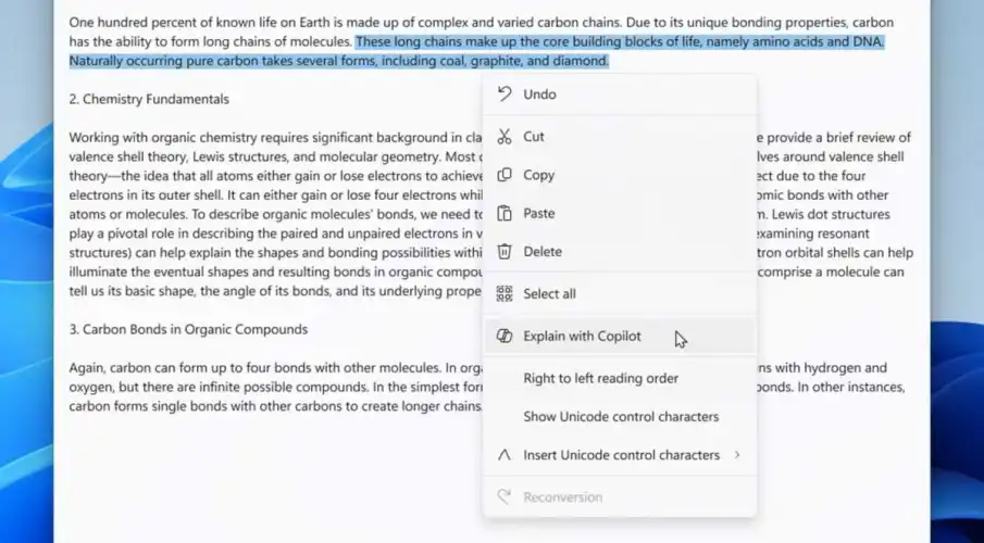 这有必要吗?微软认为是这样的。微软表示,要启动它,你可以突出显示文本,在菜单中右键点击“用Copilot解释”,或者使用新的键盘快捷键Ctrl+E。