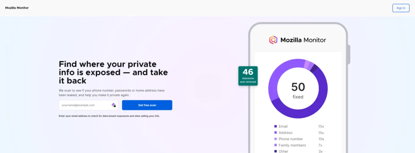 如果你选择DIY路线,你可以使用一个免费的工具,比如Mozilla Monitor,它目前可以让你在数据经纪人之间扫描你的电话号码、地址和电子邮件地址(以及已知的数据泄露)。[编辑注:Mozilla计划缩减其安全和隐私服务,因此Monitor的可用性可能会发生变化。]或者,如果你订阅了像McAfee+Premium这样的付费杀毒套件,你可以运行像个人数据清理这样的功能的基本版本。您仍然必须自己做所有选择退出的跑腿工作,但使用已知数据代理站点的列表并在每个站点上查找您自己是一种改进。你至少会得到一份首先要处理的网站的起始列表。