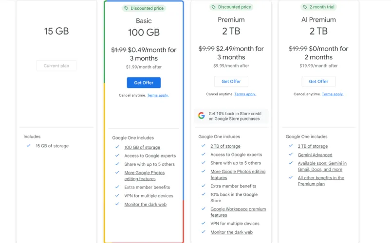 好吧,即使这样也不完全准确,因为同样的2TB Google One优惠对新用户来说是每月2.49美元,持续三个月,然后回到每月9.99美元。