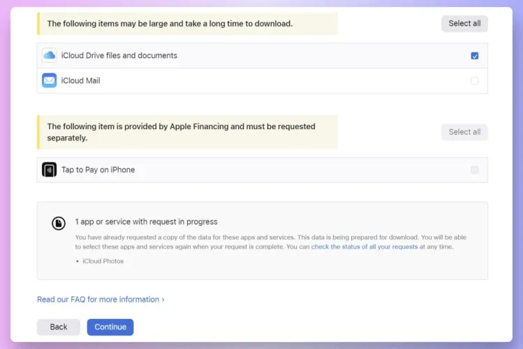 请注意,对于iCloud Drive,您可能需要等待长达七天才能获得文件。您也可以通过此方法请求iCloud照片的副本,但也会有相同的等待期。