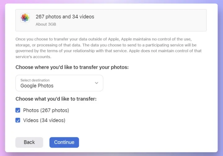 使用“选择目的地”下拉菜单并选择“谷歌照片”。