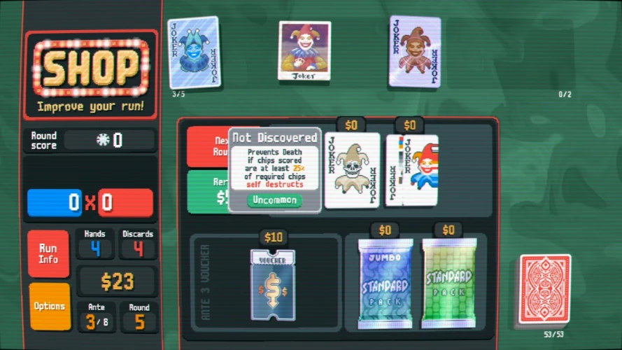 每一次失败后,你都会进入商店。在那里,你可以花你辛苦赚来的现金,以进一步加强和区分你的扑克全套选择:打破规则的小丑卡,修改塔罗牌,全息扑克牌的助推器包,可能是幽灵的卡,等等。手型,如三种或同花顺,可以通过星球牌升级,增加他们的乘数。
