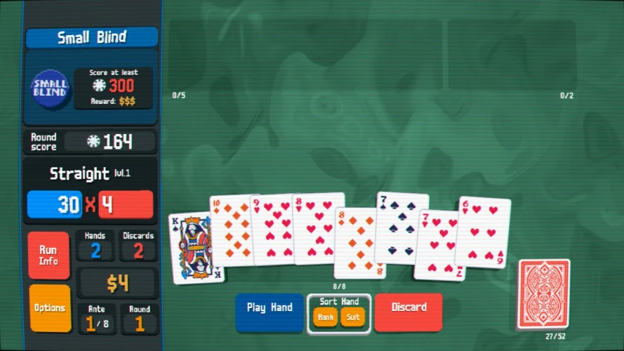 每一次跑步的开始都很简单。你玩一系列的关卡(称为“蚂蚁”),每个关卡由三个相遇(称为“百叶窗”)组成:小的,大的,和老板。在每一项中,你都必须在有限的手中达到高分。你的分数是由一个简单的数学公式决定的:X乘以Y。这两个数字都受你玩的牌的影响。更强的牌和更强的牌可以得到更多的分数,就像任何好的无赖一样,你可以在乘数的基础上增加乘数,让这些数字不断增加。扑克规则适用于手牌的力量;四个牌局的筹码比满堂的筹码多,同花顺的筹码比同花顺的筹码多,等等。赢一轮会赚到钱,然后花在巴拉特罗的店里–这才是真正的游戏开始的地方。