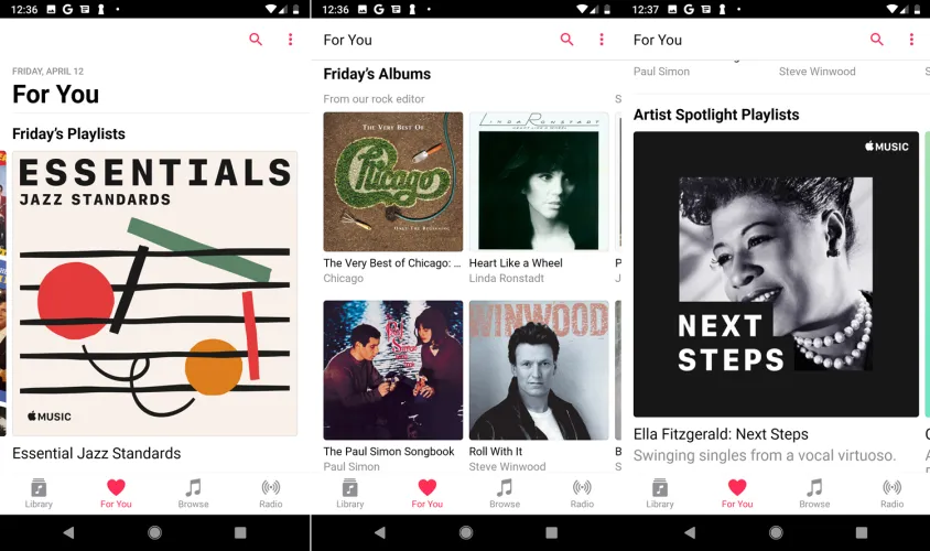另一种寻找新的个性化音乐的方法是立即收听。位于Apple Music应用程序的第一个标签中,它将成为您的首选音乐发现中心。它将展示与你的音乐库相似的专辑,提供节目广播,并以不同时代的音乐为特色。