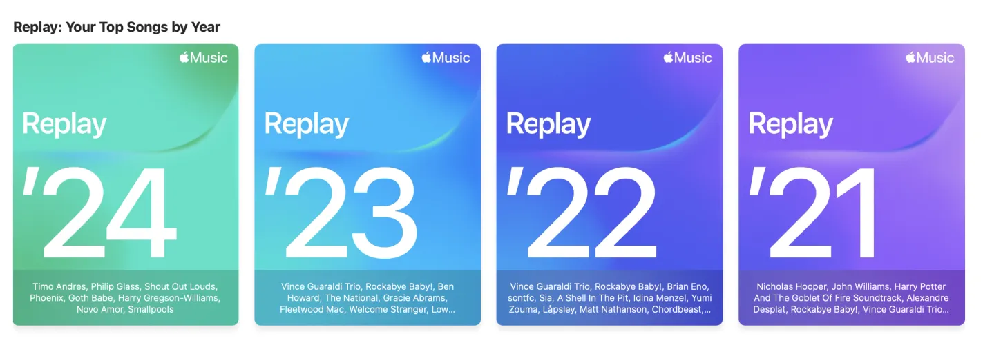 苹果的Replay Mix播放列表现在每周更新一次,播放你最喜欢的歌曲。2024年版的播放列表现在已经可以使用,可以在Apple Music应用程序内的Listen Now部分的底部访问。为了进一步挖掘你的收听历史,你需要从网络浏览器访问replay.music.apple.com。