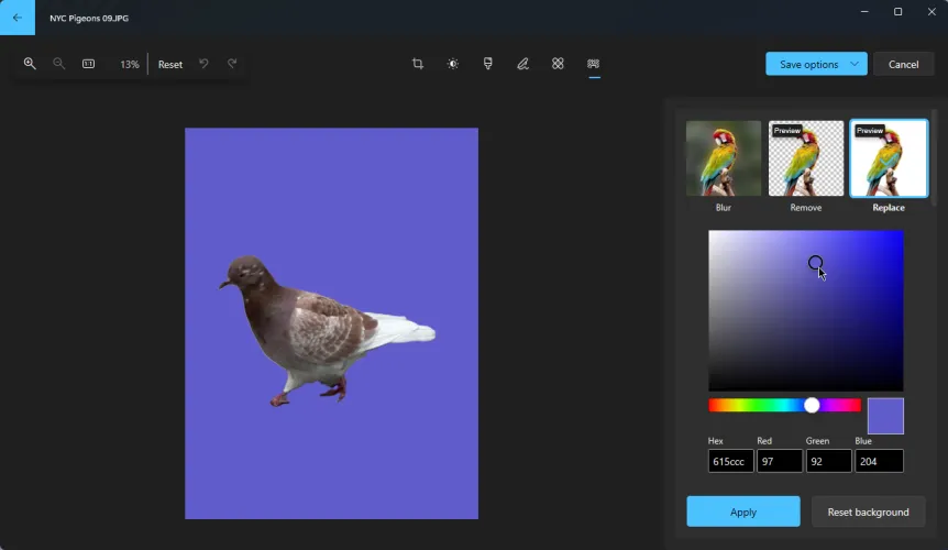 单击替换按钮,将出现调色板。在调色板上选择一种颜色,背景将更改为该颜色。您可以进一步调整颜色的色调,甚至输入十六进制代码或RGB值以获得特定颜色。完成后,单击应用。