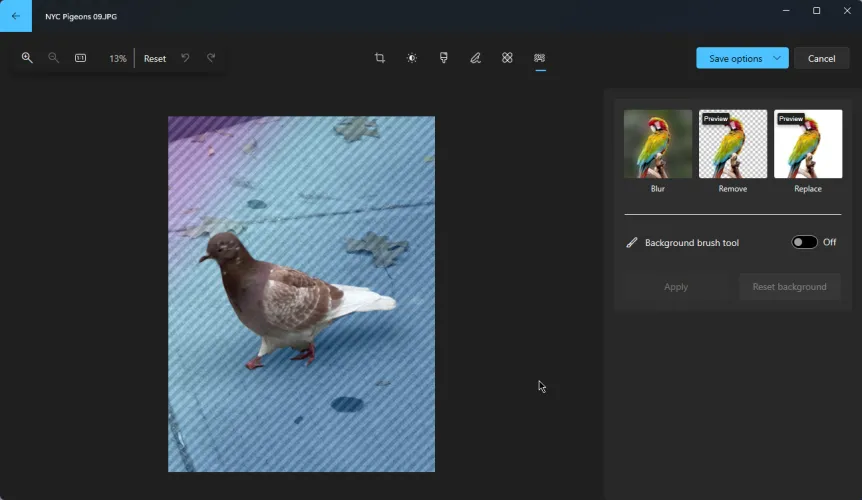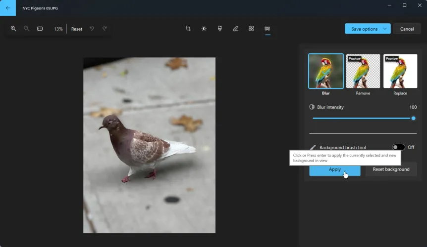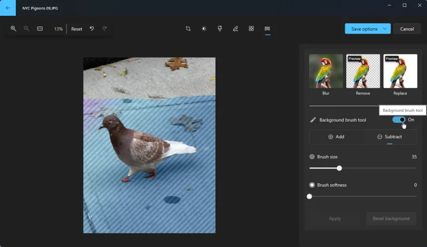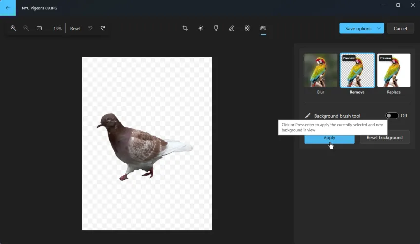 如果要在主题后面添加新背景,请单击删除按钮。这将自动擦除图像的背景,只留下照片的主题。您还可以启用背景画笔工具来更好地控制删除照片的哪些区域以及保留哪些区域。单击应用以完成编辑。