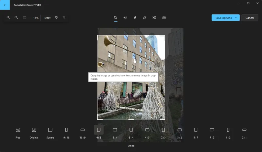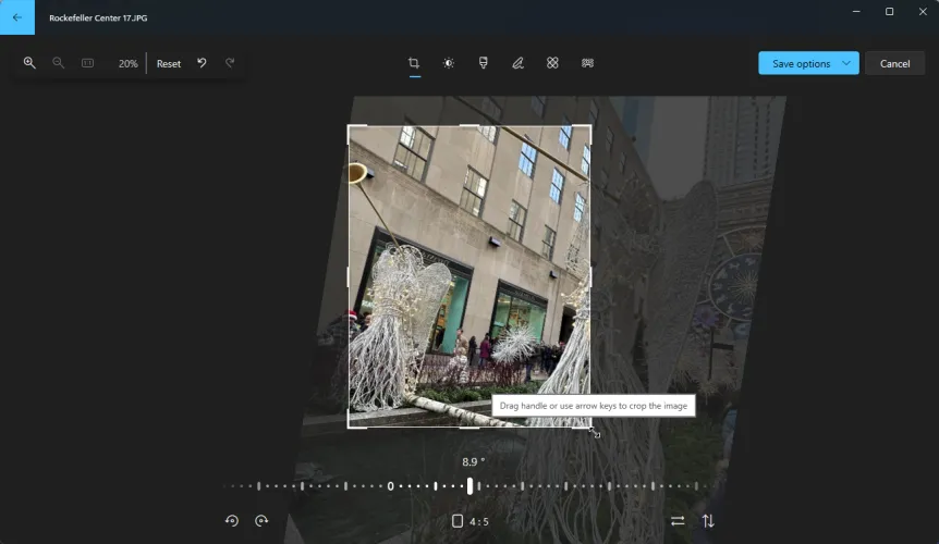 在进行其他调整后,您可能希望裁剪照片以聚焦于特定主题,或者删除不希望包含在最终图像中的元素。要裁剪它,请拖动边角或边上的手柄。裁剪照片后,您可以在画布上拖动它,使其包含您需要的元素。