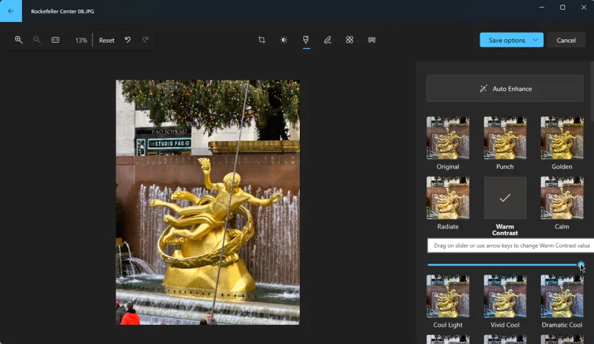 选择特定滤镜后,移动其滑块以增加或降低强度。或者,点击自动增强按钮,告诉应用程序使用正确的滤镜和强度自动增强您的照片。