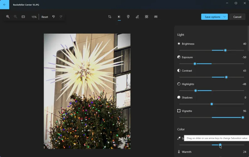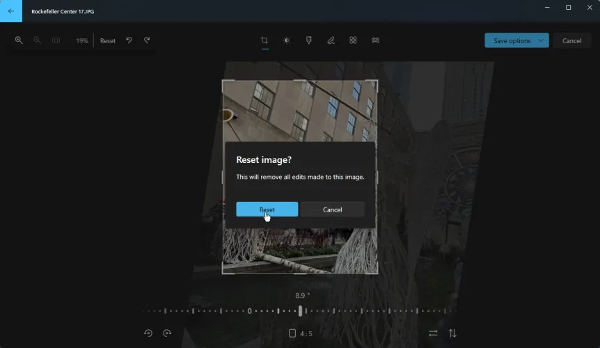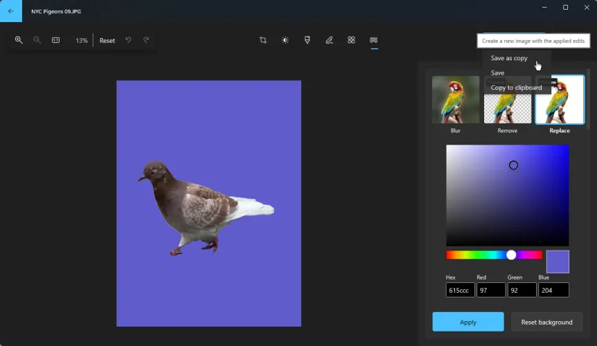 当您编辑完照片并希望保留更改时,请单击顶部的保存选项按钮。这为您提供了三个选项。另存为副本保存照片的副本,同时保留原件。保存会用新版本覆盖原始版本。复制到剪贴板允许您将图像粘贴到不同的应用程序或文件中。