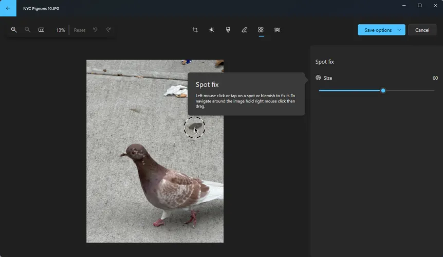 在Spot Fix下,将滑块向右或向左移动以更改要删除的Spot的大小。屏幕上会出现一个浮动圆圈。将圆拖动到要修复的区域,然后单击。再等几秒钟,斑点就会慢慢消失。