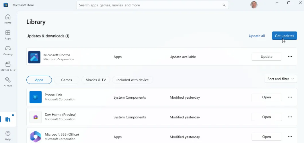 接下来,你应该在Windows上运行最新版本的Photos应用程序。打开Microsoft应用商店应用,单击库图标,选择获取更新,然后单击全部更新。这将更新你的所有Microsoft应用商店应用,包括照片。