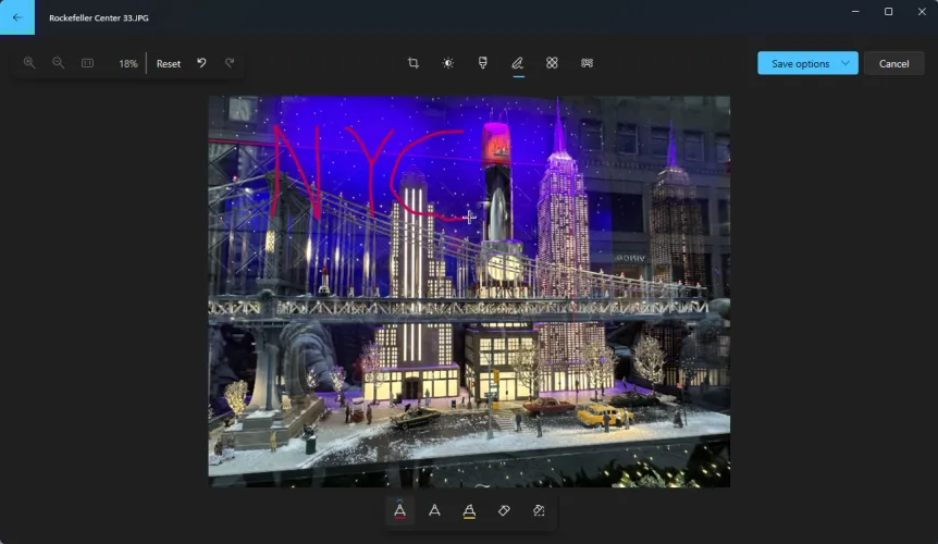 如果你想在照片上画画,点击应用程序顶部的标记图标(它看起来像一支笔)。从底部的工具栏中,选择其中一种钢笔工具或荧光笔在照片上随意绘制。如果您犯了错误,请选择橡皮擦工具并在要删除的标记上绘制。要清除所有标记,请单击清除所有标记的图标。