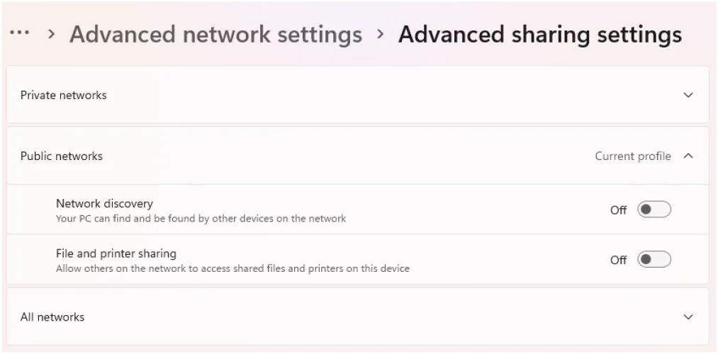 当你用一台PC连接到网络时,无论是Windows还是Mac,目标通常是共享一些服务–至少是文件和打印能力。如果你在热点上打开了共享选项,并连接到了错误的东西,你就给了坏人很容易的访问权限。在你出门之前,把它关掉。在Windows中,转至设置>网络和互联网>高级网络设置>高级共享设置。*在公共网络下,关闭网络发现以使您的电脑不可见,并关闭文件和打印机共享以避免共享。