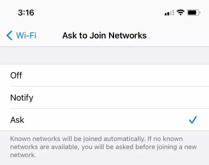如果设备首先询问,你就有机会决定连接是否安全。例如,在iOS上,进入设置>Wi-Fi>询问加入网络,然后选择询问。在安卓系统上,具体路径会有所不同,但请在设置中查找网络和互联网>Wi-Fi>网络首选项。为公共网络启用通知。