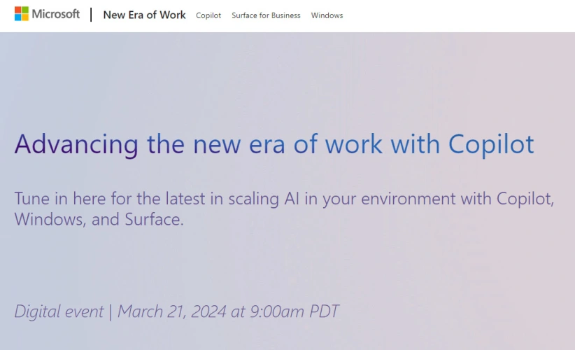 公告页面的标题是“推进与副驾驶合作的新时代”。紧随其后的是“点击这里,了解使用Copilot、Windows和Surface在您的环境中扩展人工智能的最新情况。”除了活动将于上午9点开始这一事实外,就所有实质性信息而言,这就是最重要的信息。太平洋时间,东部时间中午。