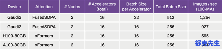 目前Stable Diffusion开发商Stability AI发布了一份报告,在报告中Stability AI重点对比了英伟达与英特尔计算卡在AI作图上的效率。以参数为2B的MMDiT模型为例,训练深度设置为24、BFloat16的混合精度,在该模型设置下,Gaudi 2计算卡最高可以达到每秒训练1254张图片,而256容量下则是每秒927张。这个性能要比英伟达现在的H100更加出色,比如说H100-80GB计算卡的训练速度为每秒595张,而A100-80GB则是每秒训练381张,也就是说基于英特尔Gaudi 2的训练速度在相同容量下比H100计算卡提升55%,更是A100性能的2.43倍。